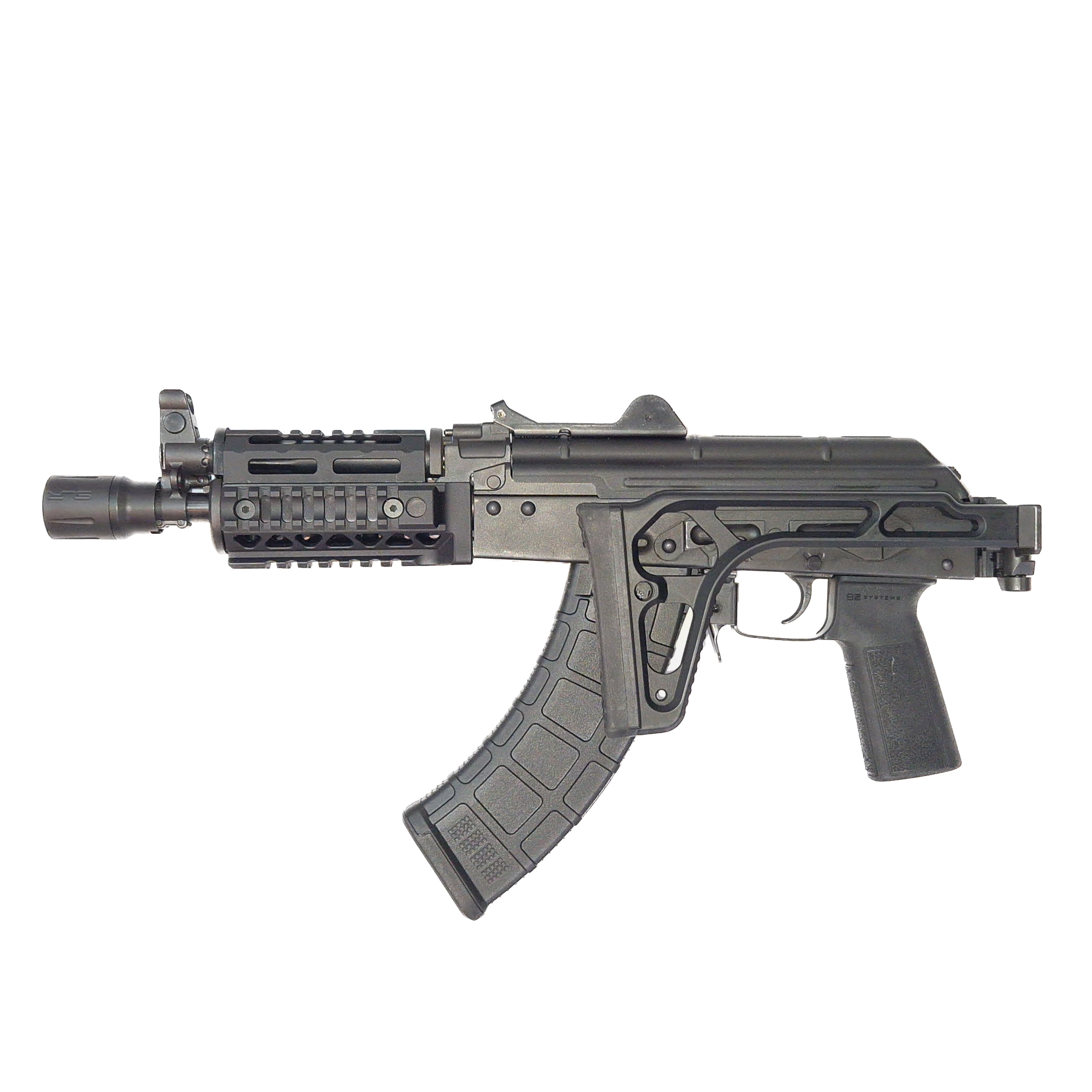 This is Riley Defense pistol variant of the krink, chambered in 7.62x39mm and measures 21” in overall length. This model utilizes a threaded (#10-32 screws), modular rear Trunnion that can accommodate a brace by using a pig-nose adapter, IF permitted by the ATF/State/local laws.