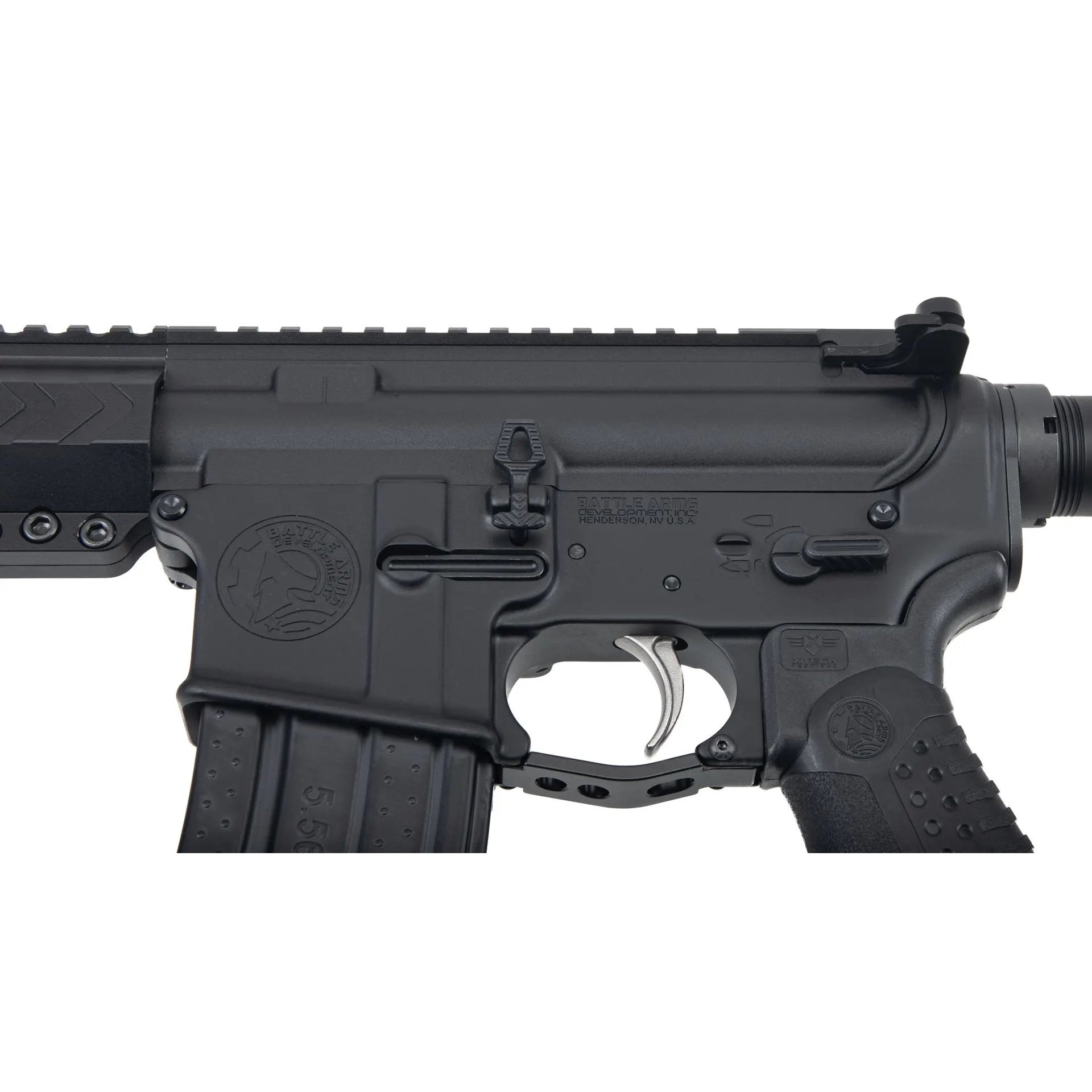 The BATTLEARMS® WORKHORSE® series of firearms are built for duty and hard use in mind. It is purpose-built around the forged BAD-15 7075-T6 aircraft-grade aluminum receiver and free-float rail handguard with M-LOK attachment point at 3, 6, and 9 o’clock positions. At 12 o’clock is a full-length Picatinny accessory rail with their signature notch cut matching the upper receiver. Every firearm is equipped with a 4150 chrome-moly steel black nitride barrel for durability and accuracy. Each barrel is individually head-spaced with a matching 9130 steel bolt and 8620 black nitride carrier for ultimate reliability and ease of cleaning.