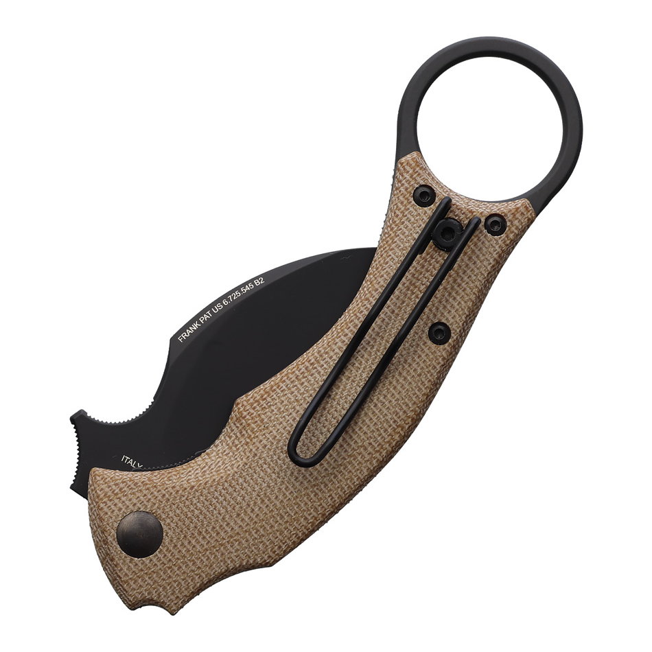 Tan canvas micarta handle. Extended tang. Finger ring. Pocket clip.