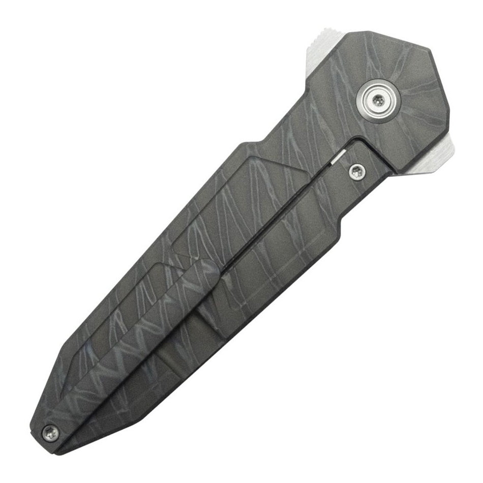 4.88″ (12.4cm) closed. 3.25″ (8.26cm) satin finish false edge Bohler M390 stainless dagger blade. Flame anodized titanium handle. Extended tang. Pocket clip