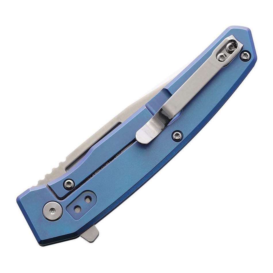 4.25″ (10.8cm) closed. 3.25″ (8.26cm) satin finish AUS-8 stainless tanto blade. Blue anodized titanium handle. Extended tang. Pocket clip.