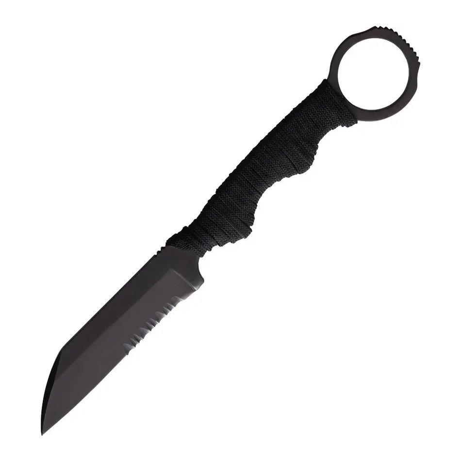 7.88″ (20.02cm) overall. 3.5″ (8.89cm) black finish partially serrated Bohler N690 stainless blade. Black cord wrapped handle. Finger ring. Full, extended tang. Black molded plastic belt sheath